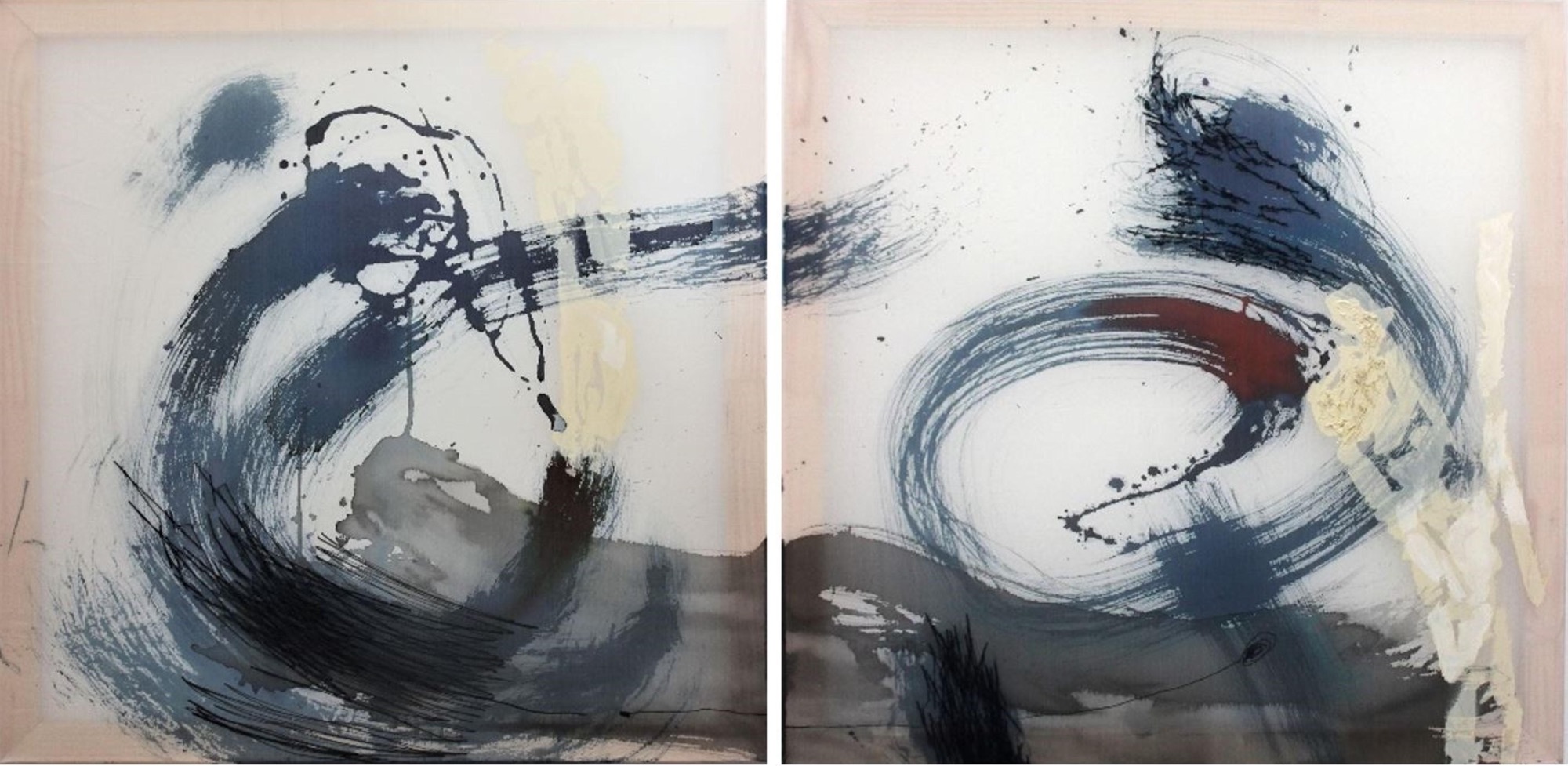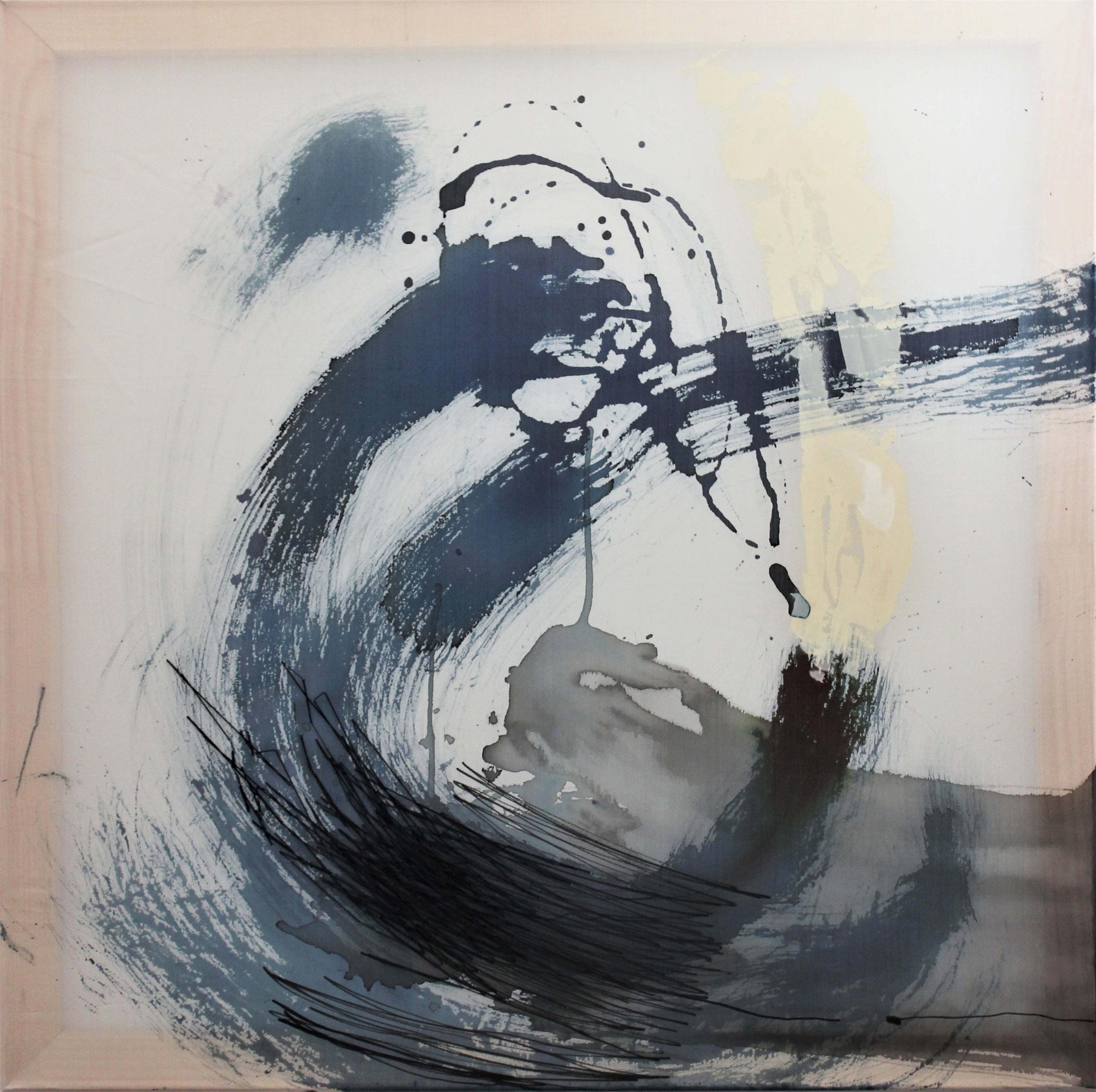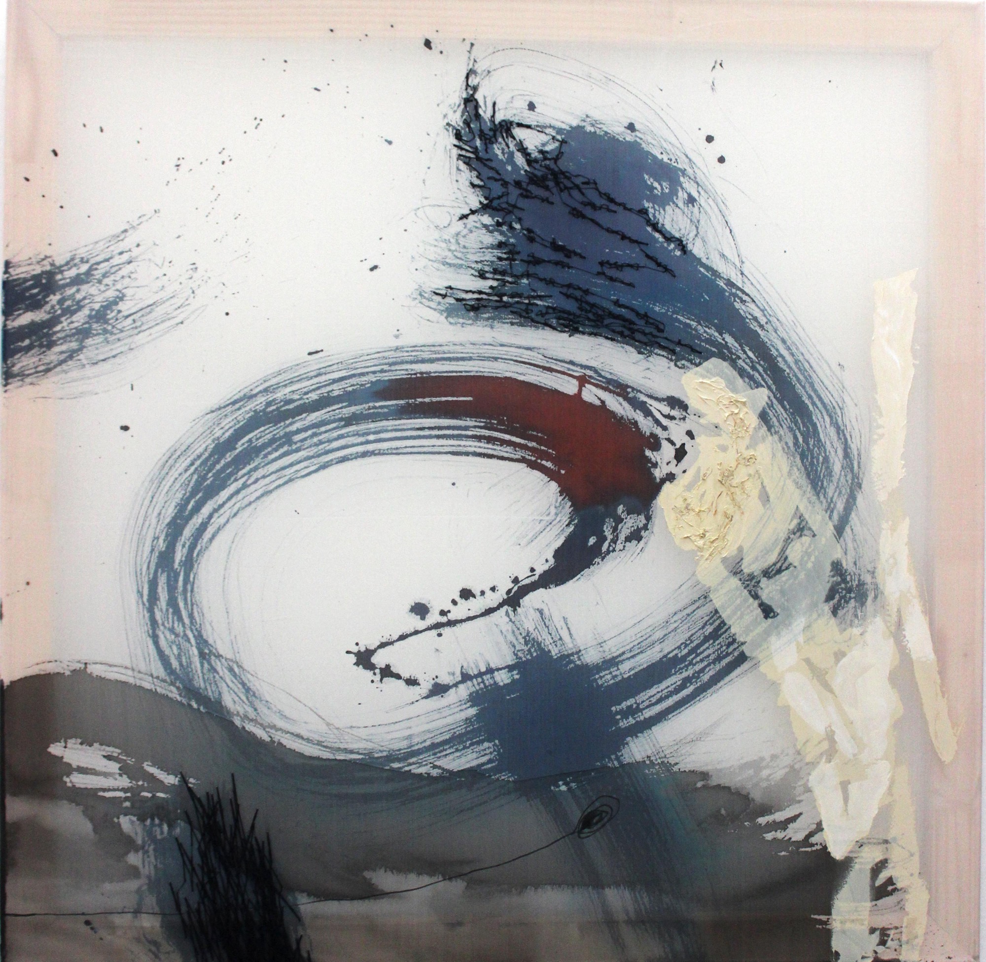 Technique mixte sur soie, broderie, fil de coton noir, pigments