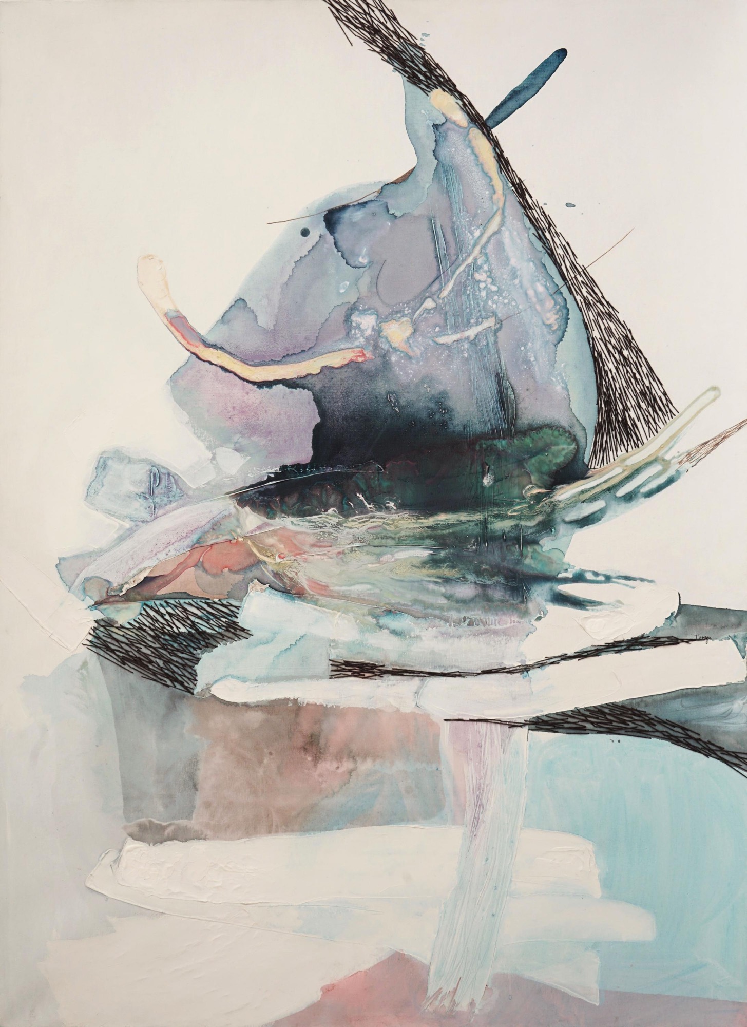 Mixed media on silk, embroidery, black cotton string, pigments, acrylic, glues, ink